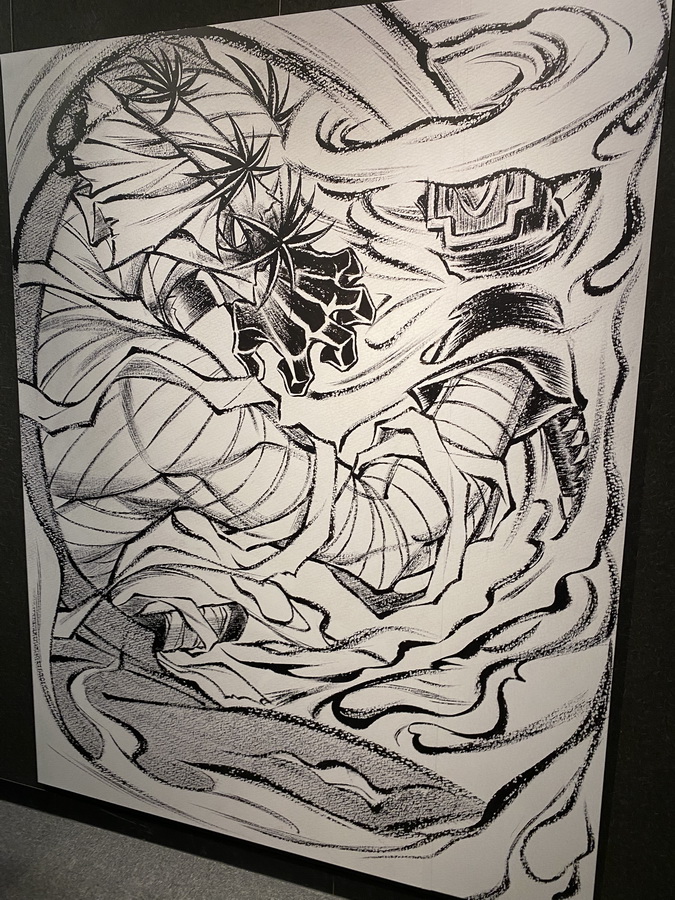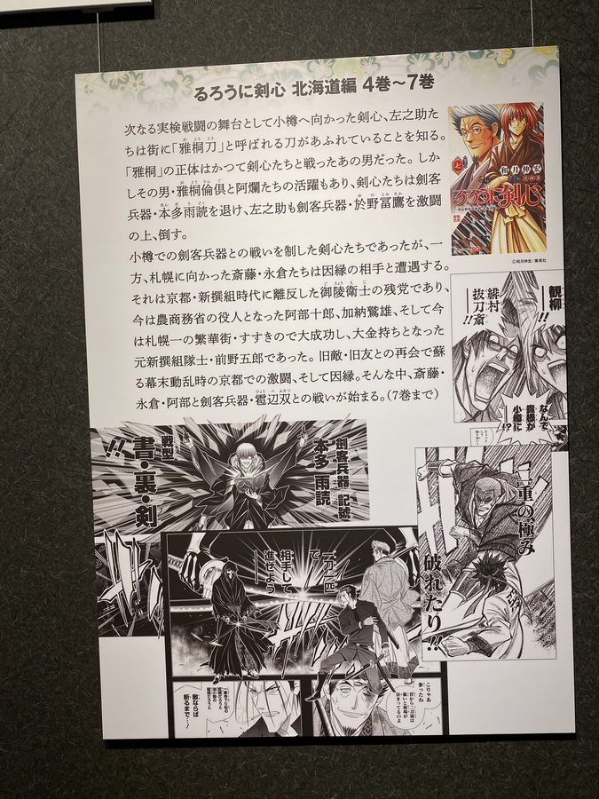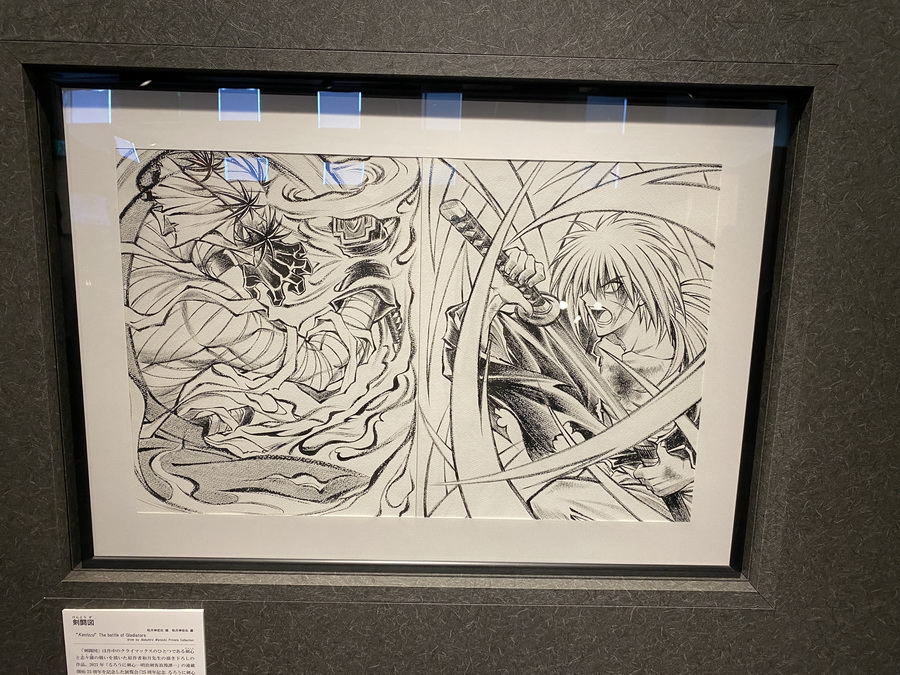 There’s info on the manga, some info boards explaining who Kenshin and Shishio are, and a lovely ink illustration of the two characters in battle. It’s really cool and I love how they blew up the images of the original art.