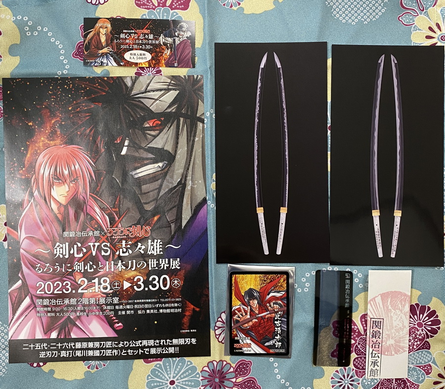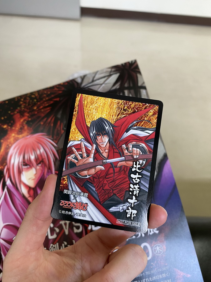I was able to get quite a few goodies for the exhibit: a flyer, a character card, two large-sized postcards featuring both Kenshin’s sakabato and Shishio’s Mugenjin, a transparent bookmark, and, of course, an entry ticket with the special exhibit featured on it.